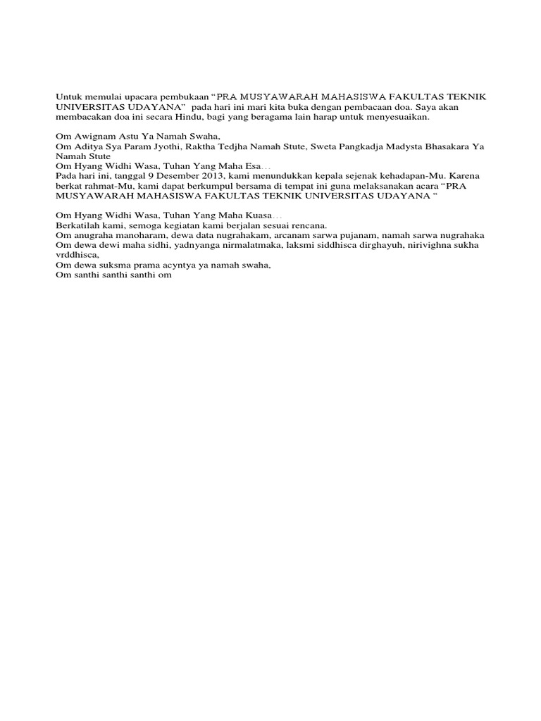 Oṁ awighnam astu namo sidhham. Doa Sebelum Makan Terpujilah Sang Buddha Dhamma dan Sanggha. HinduSebelum memulai suatu pekerjaan.