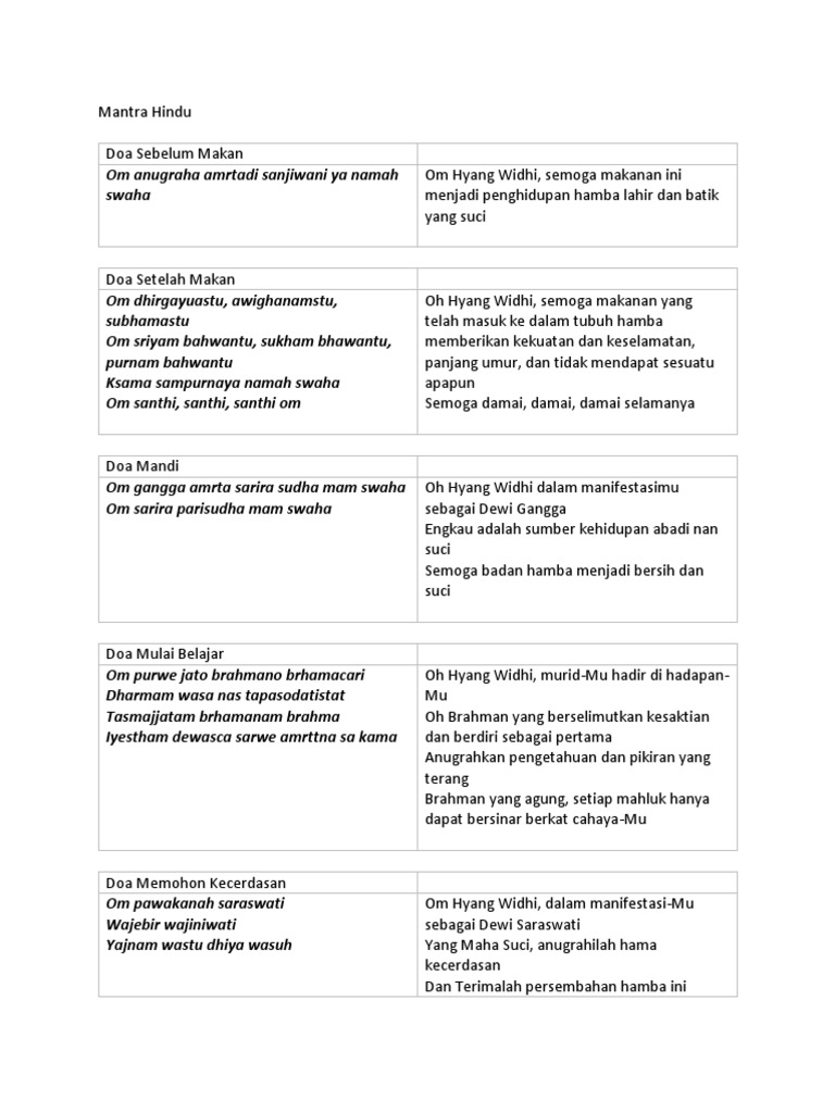 Oṁ Sang Hyang Widhy Wasa semoga atas perkenanMu tiada suatu halangan bagi hamba memulai pekerjaan ini dan semoga berhasil baik. Doa Sebelum dan Sesudah Makan. Misalnya doa mulai bekerja belajar hingga mengunjungi orang sakit ada doa khusus yang dipanjatkan.